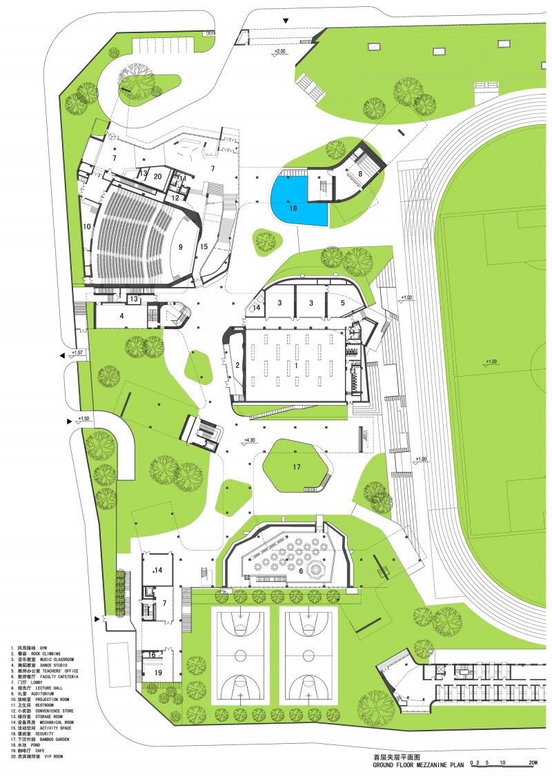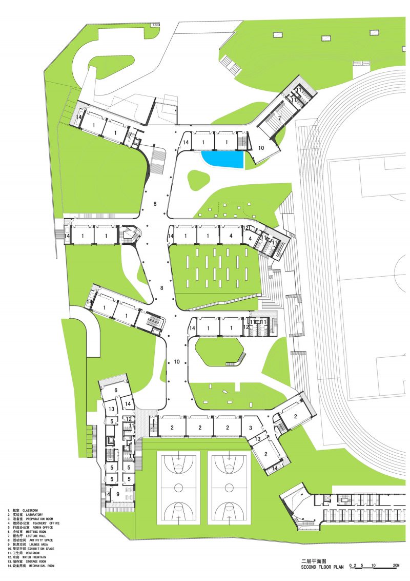 两种类型的教育空间之间的张力,及其各自包含的丰富的功能,造就了令人惊讶的空间的复杂性。为每类不同的功能所做的适合其个性的空间,使得这个功能繁杂的校园建筑具备了城市性的体验。 与一个典型的校园通常具有的分等级的空间组织和用轴线来约束大致对称的运动所不同,这个新学校的空间形式是自由的、多中心的,可以根据使用者的需求从任意可能的序列中进入。空间的自由通透鼓励积极的探索并期待不同个体从使用上的再创造。希望学校的物理环境能启发并影响当前中国教育中一些亟需的变化。