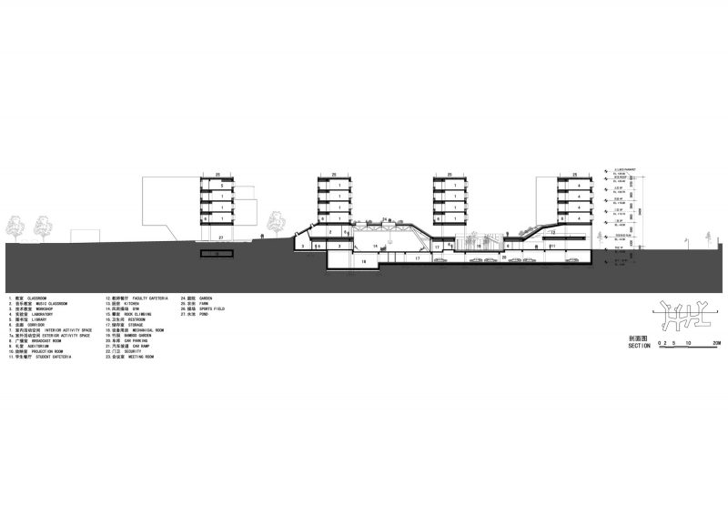 创造更多充满自然的开放空间的设计出发点——这是今天中国城市学生所迫切需要的东西,加上场地的空间限制,激发了我们在垂直方向上创建多层地面的设计策略。学校的功能空间被组织成上下两部分,并在其间插入了花园。 垂直并置的上部建筑和下部空间,及它们在“中间地带”(架空的夹层)以不同方式相互接触、支撑或连接,这既是营造空间的策略,也象征了这个新学校中正式与非正式教学空间的关系。