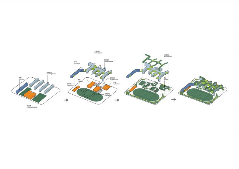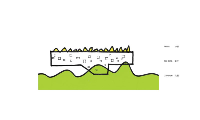 下部空间包含一些大体量、非重复性的校园公共功能,如食堂、礼堂、体育馆和游泳池等。每个不同的空间,以其不同的高度需求,从下面推动地面隆起成不同形态的山丘并触碰到上部建筑的“肚皮”,它们的屋顶以景观园林的形式成为新的起伏开放的“地面”。上部建筑是根茎状的板楼,包含了那些更重复性的和更严格的功能,如教室、实验室、学生宿舍和行政楼等。它们形成了一座巨构,有扩展、弯曲和分支,但全部连接在一起。在这个巨大的结构中,主要交通流线被拓展为创建社交空间的室内场所,就像一条河流,其中还包含自由形态的“岛屿”,为小型的群组活动提供半私密的围合空间。教学楼的屋顶被设计成一个有机农场,为36个班的学生提供36块实验田,不仅让师生有机会学习耕种,还对这片土地曾作为农田的过去留存敬意。
