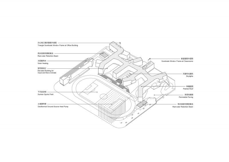 @染渲这个项目的一个目标是成为中国第一个绿色三星级的学校(其标准超过LEED金级认证)。为了最大化地利用自然通风和自然光线,并减少冬天及夏天的冷热负荷,被动式节能策略几乎运用在设计的方方面面中,大到建筑的布局和几何形态,小到窗户的细部设计。地面透水砖的铺装和屋顶绿化有助于减少地表径流,三个位于地下的大型雨水回收池从操场收集宝贵的雨水灌溉农田和花园。地源热泵技术为大型公共空间提供了可持续能源,同时独立控制的VRV机组服务于所有单独的教学空间,确保使用的灵活性。整个项目使用了简单、自然和耐用的材料,如竹木胶合板、水刷石(一项正在消失的工艺)、石材和暴露混凝土等。