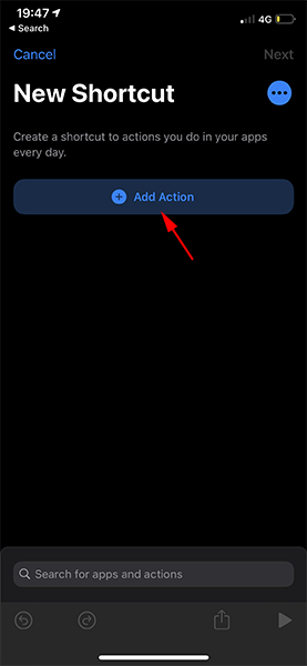 新建一个Shortcut,点击Add action 添加一个动作,搜索“text”或“文本”。