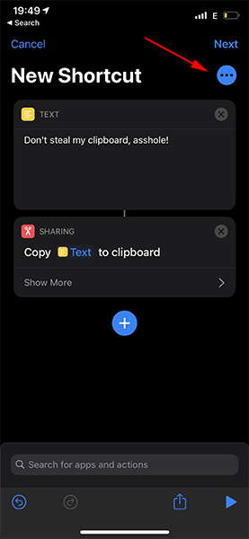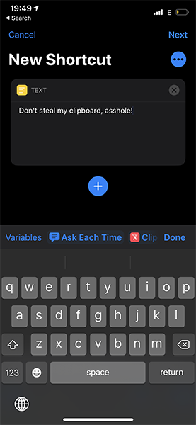 在这个text动作里随便写点什么,这些将会给到剪贴板,送给隐私盗贼们。