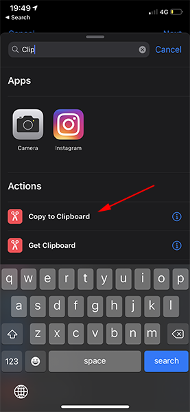 再添加一个action,搜索“clipboard”或者“剪贴板”,选择“ Copy to clipboard” (拷贝到剪贴板)