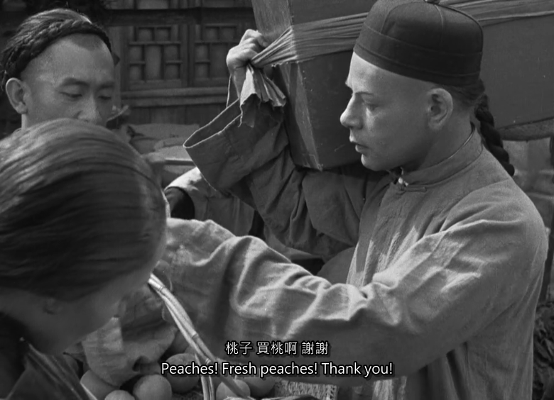 开心的王龙在路上买了两个奢侈的桃子,自己吃了一个,给媳妇儿一个。