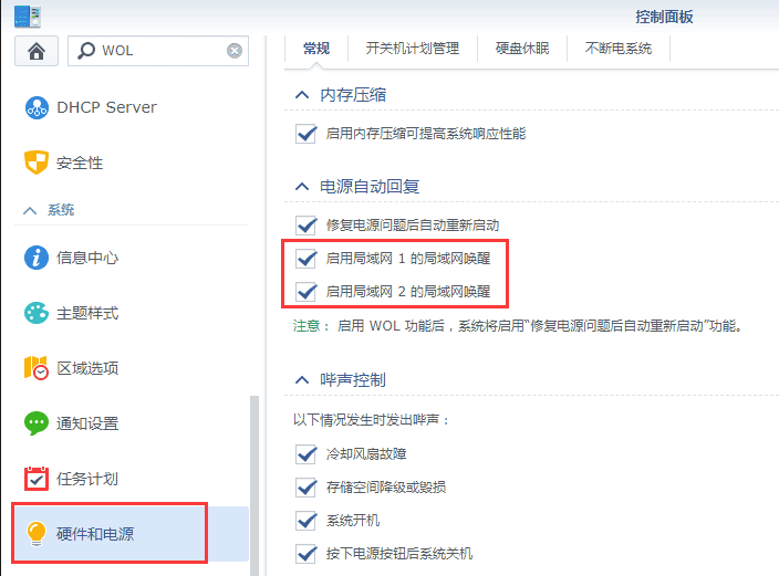 首先当然是群晖自己必须先打开局域网唤醒,如果有多个网口,建议将所有网口的唤醒都打开。